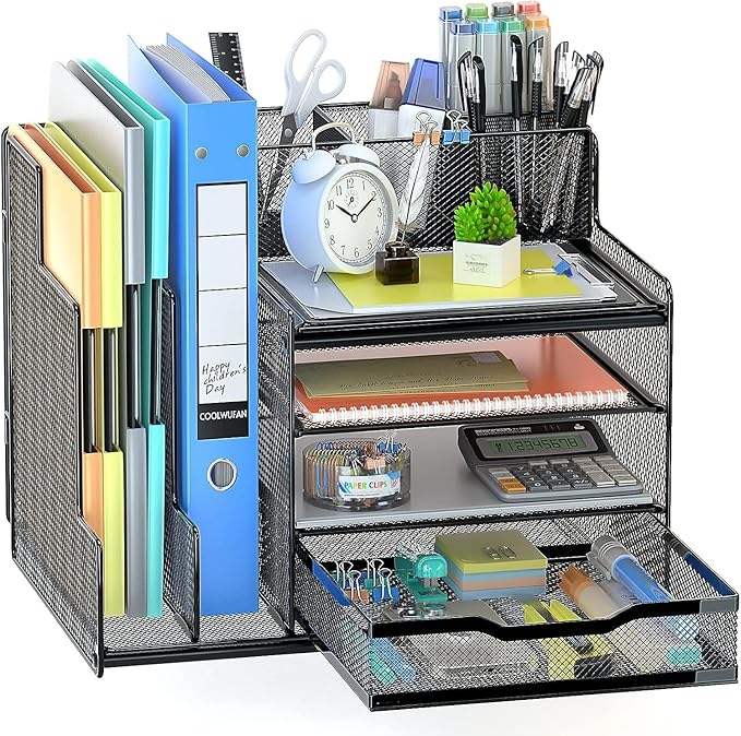 The Sooyinpaint 4-Tier Desk Organizer features vertical file holders, a mesh drawer, and an upright pen holder for efficient storage. Perfect for organizing documents, stationery, and office supplies, it’s ideal for home and workplace use.
